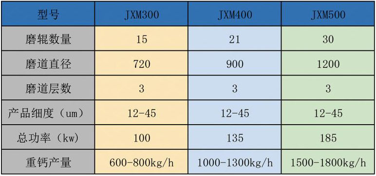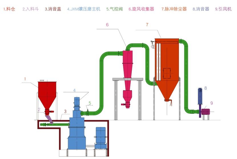 JXM環輥微粉磨(中速微粉磨)全套設備包括:錘式破碎機、斗式提升機、儲料倉、電磁振動給料機、主機、選粉機、擴散式雙旋風集粉器、脈沖式除塵器、高壓風機、消聲器。主機電動機通過減速機帶動主軸及各層轉盤旋轉,轉盤通過柱銷帶動幾十個環輥在磨環滾道內滾動并旋轉。大塊物料經破碎機破碎成小顆粒后由提升機送入儲料倉,電磁振動給料機將物料均勻的送到上轉盤的中部,物料在離心力的作用下散向圓周邊,并落入磨環的滾道內被環輥沖壓、滾碾、研磨而粉碎,物料經第 一層粉碎后又落入第二層及第三層,高壓離心風機的抽吸作用將外部空氣吸入機內,并將經過第三層粉碎后的粗粉帶入選粉機內。選粉機內旋轉的渦輪所產生的渦流使粗顆粒物料回落重磨,細粉則隨氣流進入旋風集粉器并由其下部的卸料閥排出即為成品,而帶有少量細粉塵的氣流則經過脈沖除塵器凈化后通過風機及消聲器排出。